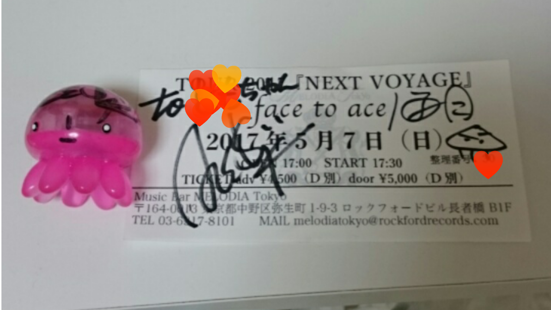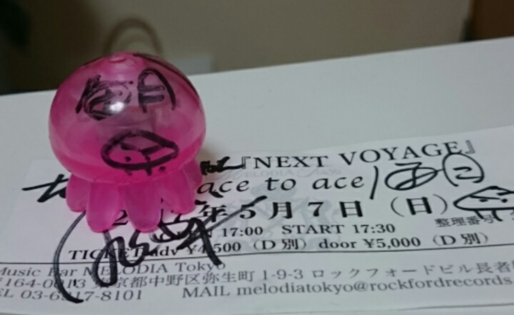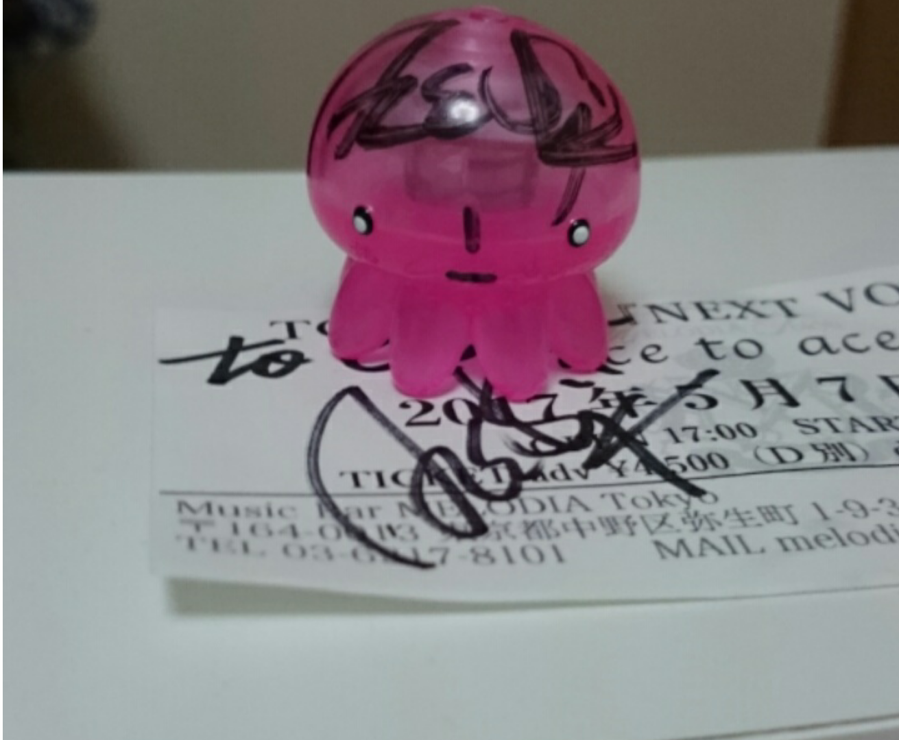 フィギアのクラゲちゃん、おっきい方は海月さんに貢ぎ、ちっさい方にサインをして貰いました。あと顔も書いて貰った…こげパンみたい~(苦笑)