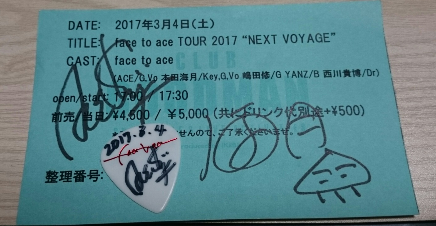 で、この日はエースの真正面を確保できた訳で…最後のアンコールで投げたピックが良い感じで飛んで来たので、思わず手を伸ばすと手に当たり、前のテーブルの上に…。おぉ、ゲット出来た~