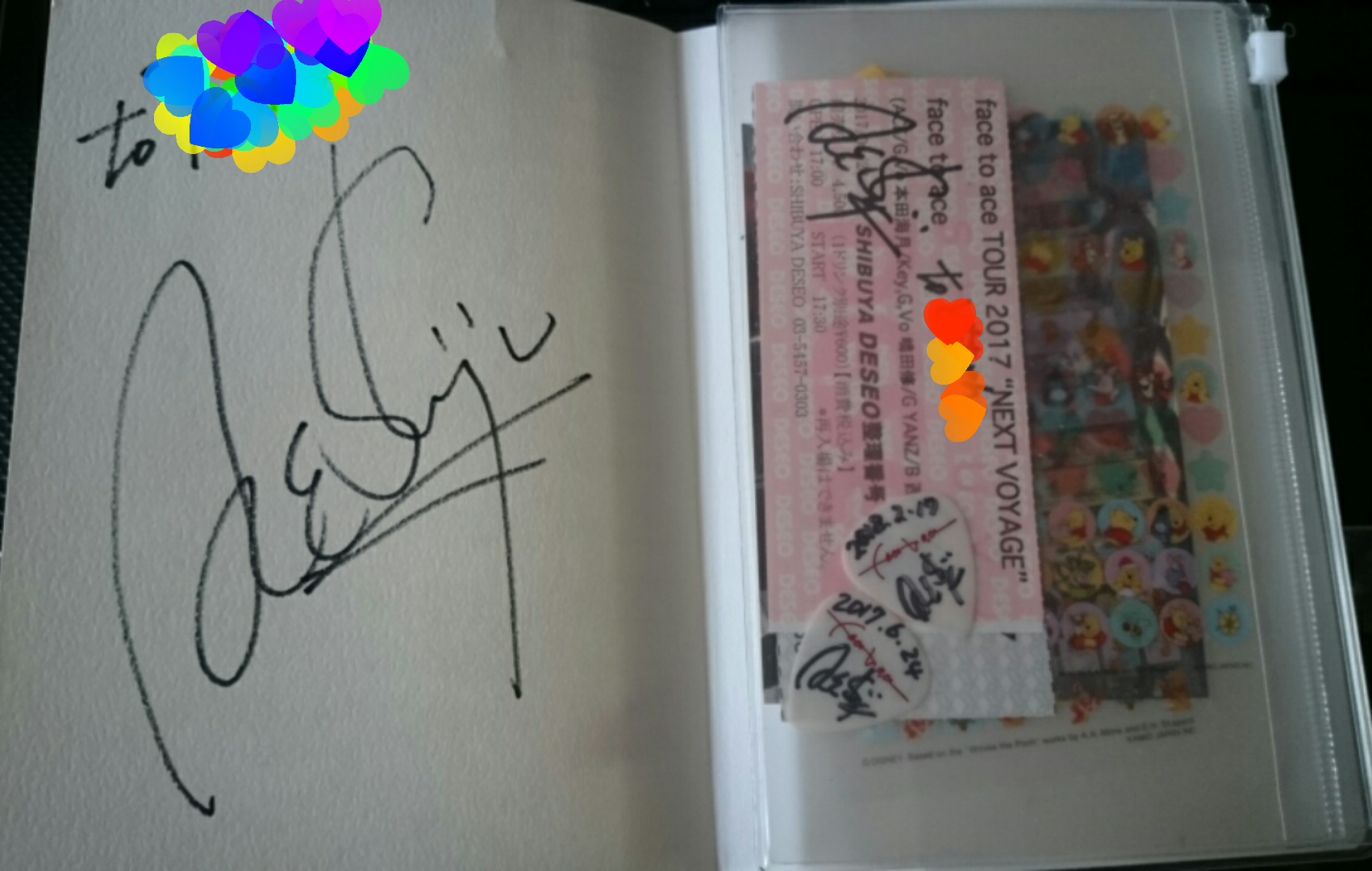 良く見ると、チケットの後ろにプーさんのシール(手帳についてるもの)があり、その更に後ろにあるのは、『MASQUERADE』のCDについていた構成員の写真のシールです…(笑)